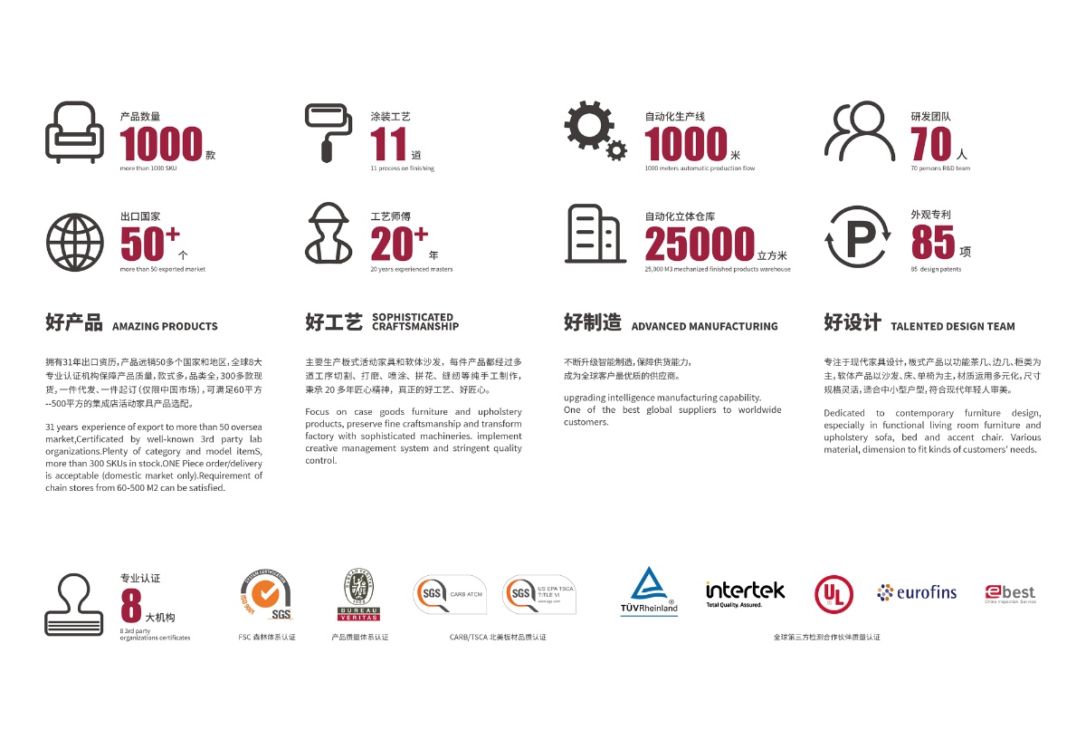 專注于客餐廳、臥室家居產品的研究、開發、生產和銷售。自1989年創立以來,歷經了兩代人30年的發展,我們忠于初心,專注在客餐廳及臥室家居產品,業務已遍布世界各大洲。